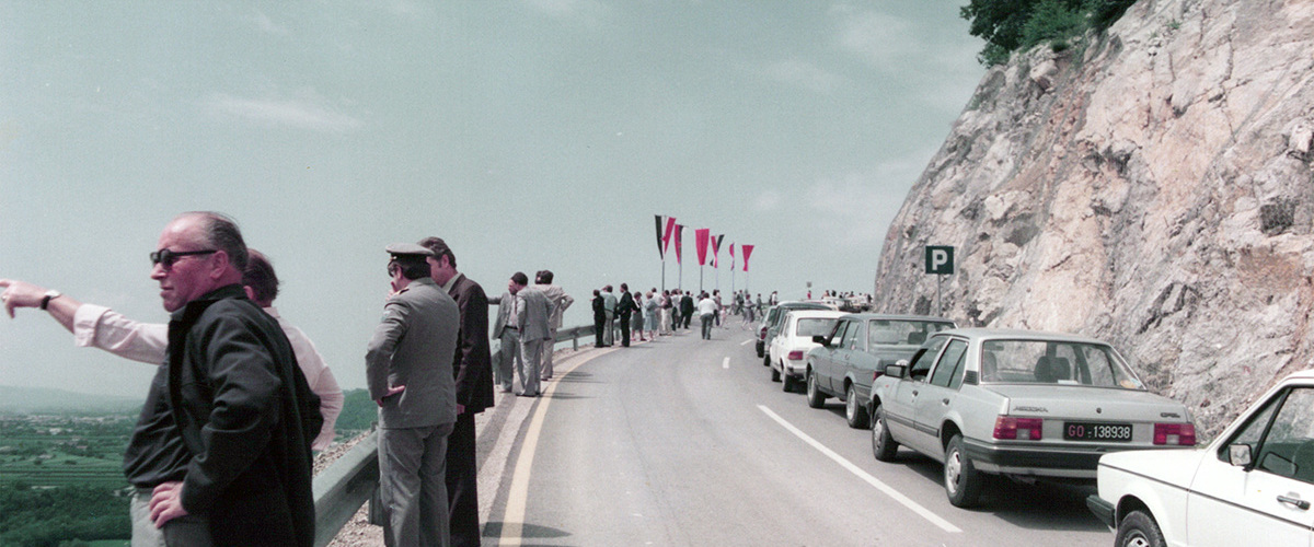 Na fotografiji, ki jo hrani Goriški muzej, gostje na dan otvoritve ceste 15. 6. 1985 gledajo na Novo Gorico.